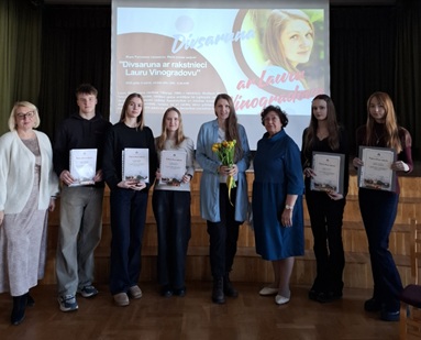 2026. gada 5.martā 11. un 12.klašu skolēni piedalījās skolas pasākumā "Tikšanās ar rakstnieci Lauru Vinogradovu. Divsaruna. Prozas lasījumi".